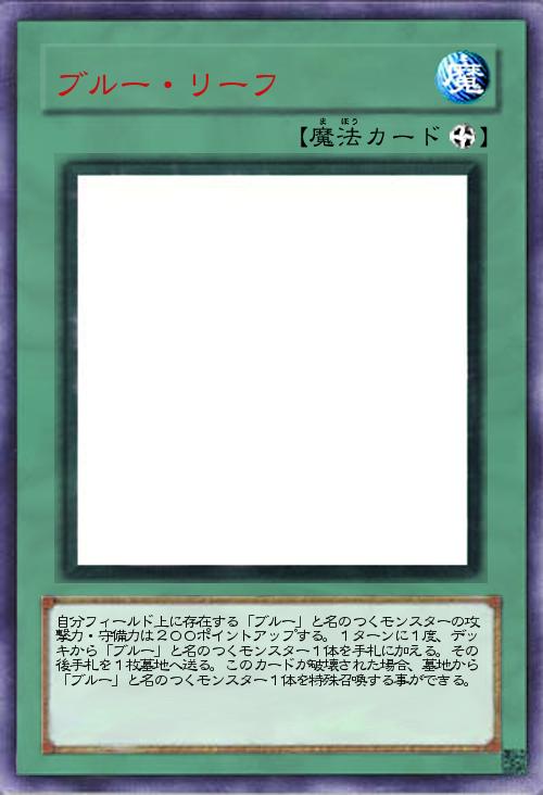 | 自分フィールド上に存在する「ブルー」と名のつくモンスターの攻撃力・守備力は200ポイントアップする。1ターンに1度、デッキから「ブルー」と名のつくモンスター1体を手札に加える。その後手札を1枚墓地へ送る。このカードが破壊された場合、墓地から「ブルー」と名のつくモンスター1体を特殊召喚する事ができる。 | |||