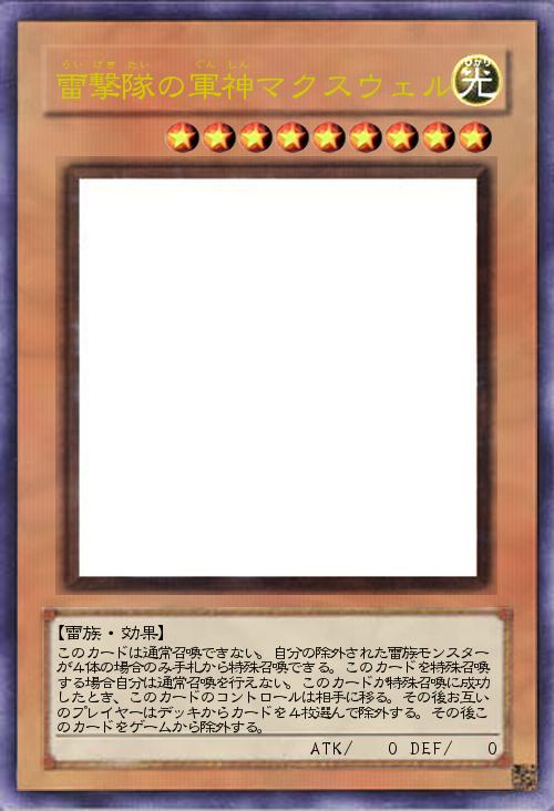 このカードは通常召喚できない。自分の除外された雷族モンスターが4体の場合のみ手札から特殊召喚できる。このカードを特殊召喚する場合自分は通常召喚を行えない。このカードが特殊召喚に成功したとき、このカードのコントロールは相手に移る。その後お互いのプレイヤーはデッキからカードを4枚選んで除外する。その後このカードをゲームから除外する。 |