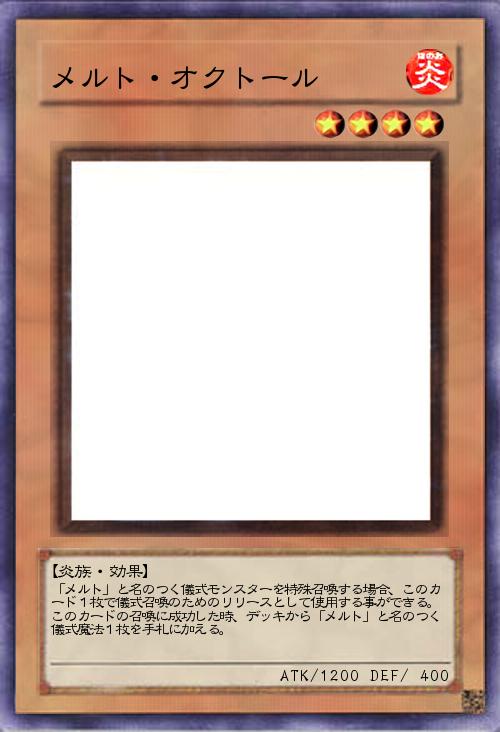 | 「メルト」と名のつく儀式モンスターを特殊召喚する場合、このカード1枚で儀式召喚のためのリリースとして使用する事ができる。このカードの召喚に成功した時、デッキから「メルト」と名のつく儀式魔法1枚を手札に加える。 | |||