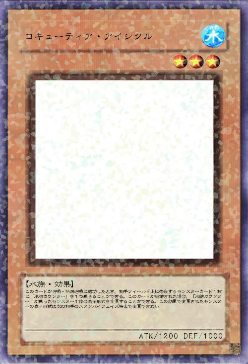 | このカードが召喚・特殊召喚に成功したとき、相手フィールド上に存在するモンスターカード1枚に「氷結カウンター」を1つ乗せることができる。このカードが破壊された場合、「氷結カウンター」が乗ったモンスター1体の表示形式を変更することができる。この効果で変更されたモンスターの表示形式は次の相手のスタンバイフェイズ時まで変更できない。 | |||