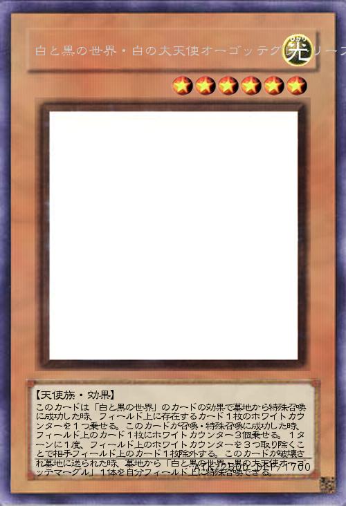 | このカードは「白と黒の世界」のカードの効果で墓地から特殊召喚に成功した時、フィールド上に存在するカード1枚のホワイトカウンターを1つ乗せる。このカードが召喚・特殊召喚に成功した時、フィールド上のカード1枚にホワイトカウンター3個乗せる。1ターンに1度、フィールド上のホワイトカウンターを3つ取り除くことで相手フィールド上のカード1枚除外する。このカードが破壊され墓地に送られた時、墓地から「白と黒の世界・黒の大天使オーゴッテマーグル」1体を自分フィールド上に特殊召喚できる。 | |||