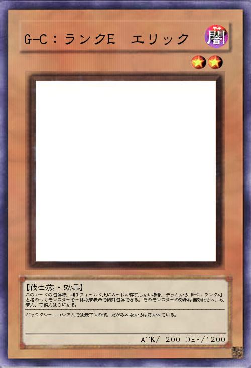 このカードの召喚時、相手フィールド上にカードが存在しない場合、デッキから「G-C:ランクE」と名のつくモンスターを一体攻撃表示で特殊召喚できる。そのモンスターの効果は無効化され、攻撃力、守備力は0になる。 ――――――――――――――――――――――――――――――――――――――――――――ギャラクシーコロシアムでは最下位の彼。だがみんなからは好かれている。 |