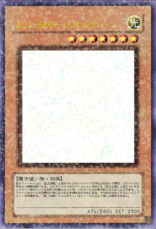 自分フィールド上に「至上法院」と名のついたモンスターが2体以上存在する場合、このカードは手札から特殊召喚できる。このカード以外のフィールド上に存在する「至上法院」と名のついたモンスター1体がカードの効果の対象になった時、このカードに対象を移しかえることができる。このカードはカードの効果の対象になったとき持ち主の手札に戻る。その後自分は1500ライフポイントを回復する。「至上法院―シエルホーン」はフィールド上に1体しか存在できない。 |