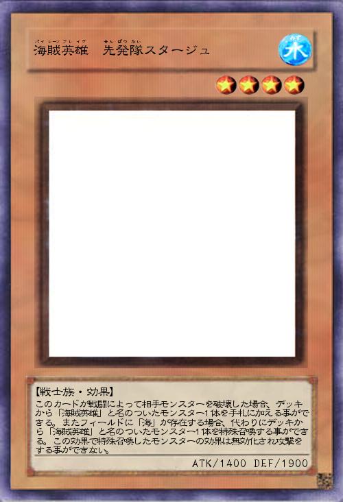 | このカードが戦闘によって相手モンスターを破壊した場合、デッキから「海賊英雄」と名のついたモンスター1体を手札に加える事ができる。またフィールドに「海」が存在する場合、代わりにデッキから「海賊英雄」と名のついたモンスター1体を特殊召喚する事ができる。この効果で特殊召喚したモンスターの効果は無効化され攻撃をする事ができない。 | |||