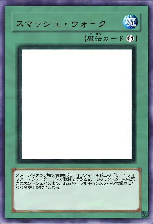 | ダメージステップ時に発動可能。自分フィールド上の「8・1ウォリアー・ウォーク」1体が戦闘を行うとき、そのモンスターの攻撃力はエンドフェイズまで、戦闘を行う相手モンスターの攻撃力に100を加えた数値となる。 | |||