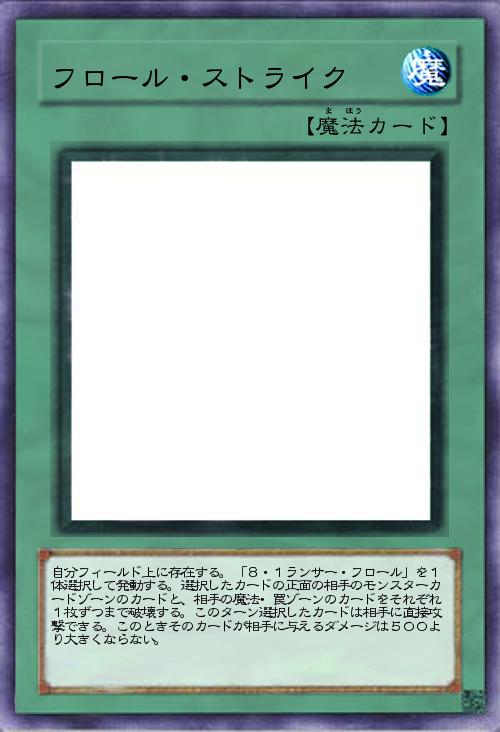 | 自分フィールド上に存在する。「8・1ランサー・フロール」を1体選択して発動する。選択したカードの正面の相手のモンスターカードゾーンのカードと、相手の魔法・罠ゾーンのカードをそれぞれ1枚ずつまで破壊する。このターン選択したカードは相手に直接攻撃できる。このときそのカードが相手に与えるダメージは500より大きくならない。 | |||