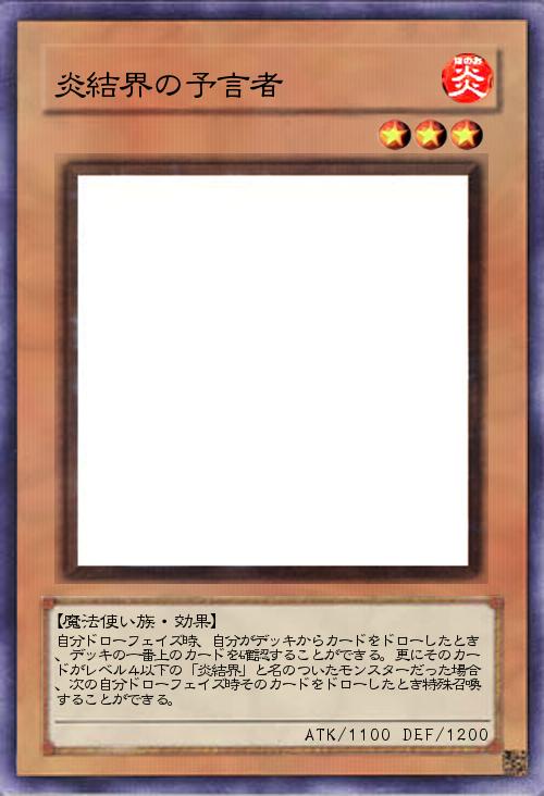 | 自分ドローフェイズ時、自分がデッキからカードをドローしたとき、デッキの一番上のカードを確認することができる。更にそのカードがレベル4以下の「炎結界」と名のついたモンスターだった場合、次の自分ドローフェイズ時そのカードをドローしたとき特殊召喚することができる。 | |||