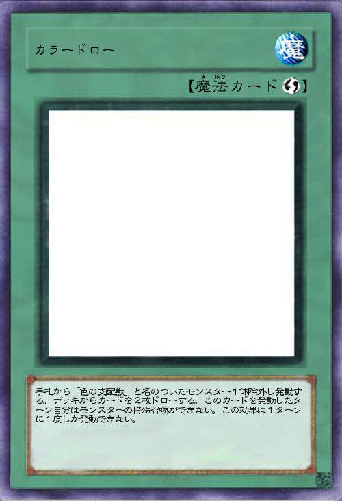 | 手札から「色の支配獣」と名のついたモンスター1体除外し発動する。デッキからカードを2枚ドローする。このカードを発動したターン自分はモンスターの特殊召喚ができない。この効果は1ターンに1度しか発動できない。 | |||