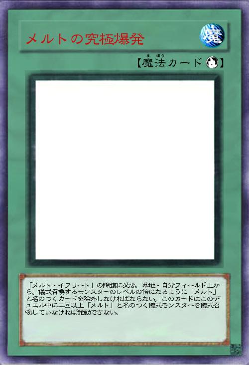 | 「メルト・イフリート」の降臨に必要。墓地・自分フィールド上から、儀式召喚するモンスターのレベルの倍になるように「メルト」と名のつくカードを除外しなければならない。このカードはこのデュエル中に二回以上「メルト」と名のつく儀式モンスターを儀式召喚していなければ発動できない。 | |||