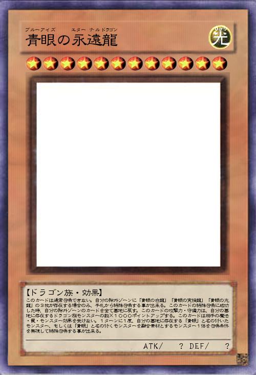 | このカードは通常召喚できない。自分の除外ゾーンに「青眼の白龍」「青眼の究極龍」「青眼の光龍」の3枚が存在する場合のみ、手札から特殊召喚する事が出来る。このカードの特殊召喚に成功した時、自分の除外ゾーンのカードを全て墓地に戻す。このカードの攻撃力・守備力は、自分の墓地に存在するドラゴン族モンスターの数×1000ポイントアップする。このカードは相手の魔法・罠・モンスター効果を受けない。1ターンに1度、自分の墓地に存在する「青眼」と名の付いたモンスター、もしくは「青眼」と名の付くモンスターを融合素材とするモンスター1体を召喚条件を無視して特殊召喚する事が出来る。 | |||
