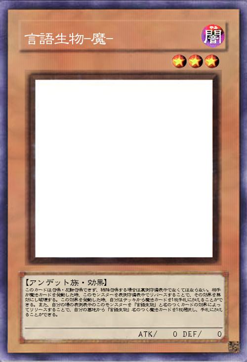 | このカードは召喚・反転召喚できず、特殊召喚する場合は裏側守備表示でなくてはならない。相手が魔法カードを発動した時、このモンスターを表側守備表示でリバースすることで、その効果を無効にし破壊する。この効果を発動した時、自分はデッキから魔法カードを1枚手札に加えることができる。また、自分の場の表側表示のこのモンスターを「言語生物」と名のつくカードの効果によってリリースすることで、自分の墓地から「言語生物」名のつく魔法カードを1枚選択し、手札に加えることができる。 | |||