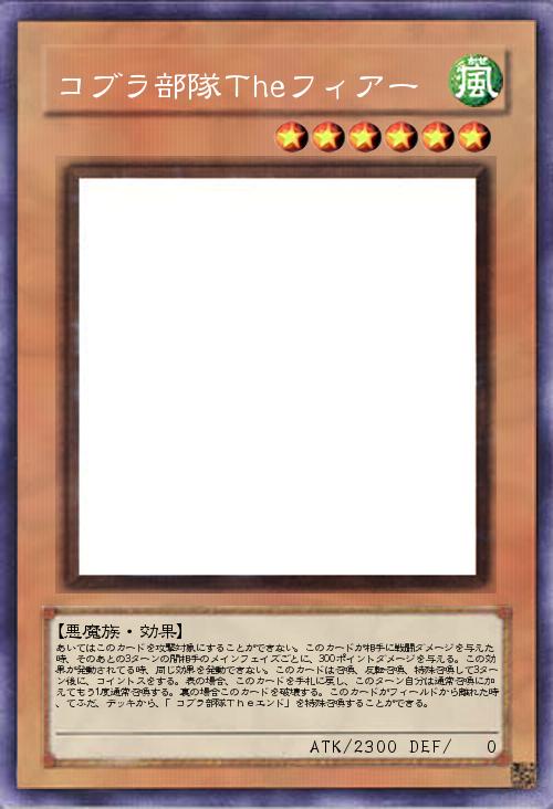 | あいてはこのカードを攻撃対象にすることができない。このカードが相手に戦闘ダメージを与えた時、そのあとの3ターンの間相手のメインフェイズごとに、300ポイントダメージを与える。この効果が発動されてる時、同じ効果を発動できない。このカードは召喚、反転召喚、特殊召喚して3ターン後に、コイントスをする。表の場合、このカードを手札に戻し、このターン自分は通常召喚に加えてもう1度通常召喚する。裏の場合このカードを破壊する。このカードがフィールドから離れた時、てふだ、デッキから、「コブラ部隊Theエンド」を特殊召喚することができる。 | |||