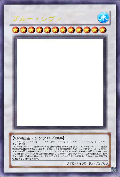 「ブルー・アップアイス」+「ブルー・ダウンアイス」+「ブルー・レフトアイス」+「ブルー・ライトアイス」 このカードはシンクロ召喚以外の方法で特殊召喚する事ができない。このカードのシンクロ召喚は無効化する事ができない。このカードのシンクロ召喚に成功したターン、相手フィールド上のモンスターの攻撃力・守備力は0になる。このカードが自分フィールド上に存在する限り、相手はカードの効果を1ターンに1度しか発動できない。このカードが自分フィールド上から離れた時、相手フィールド上の魔法・罠カード、またはモンスターをすべてデッキに戻す。このカードは効果では破壊されず、除外されない。 |