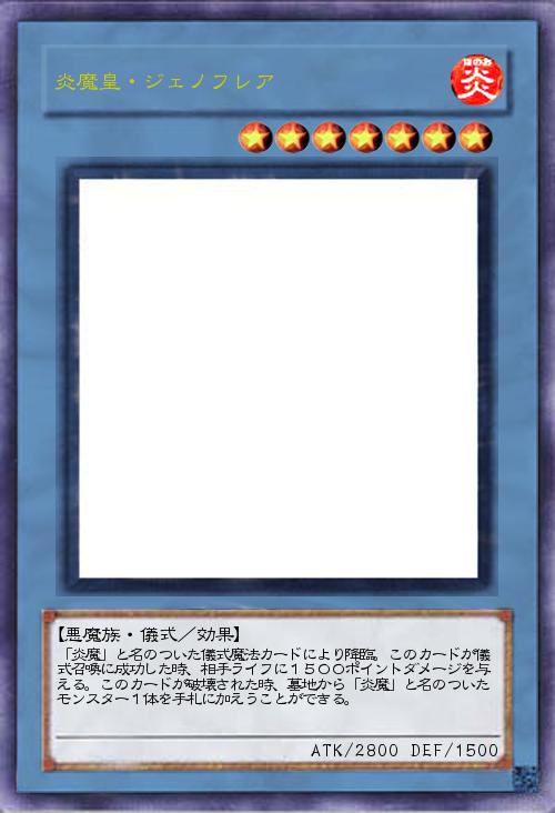 | 「炎魔」と名のついた儀式魔法カードにより降臨。このカードが儀式召喚に成功した時、相手ライフに1500ポイントダメージを与える。このカードが破壊された時、墓地から「炎魔」と名のついたモンスター1体を手札に加えうことができる。 | |||