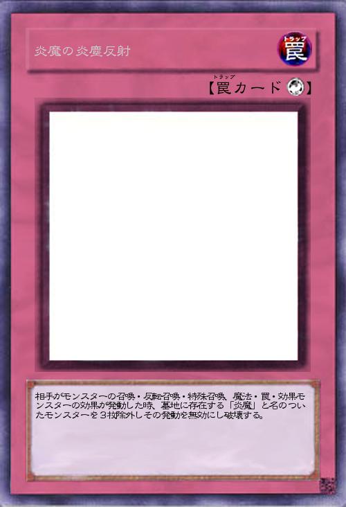 | 相手がモンスターの召喚・反転召喚・特殊召喚、魔法・罠・効果モンスターの効果が発動した時、墓地に存在する「炎魔」と名のついたモンスターを3枚除外しその発動を無効にし破壊する。 | |||