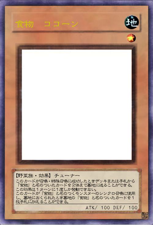 このカードが召喚・特殊召喚に成功したときデッキまたは手札から「食物」と名のついたカードを2体まで墓地に送ることができる。この効果は1ターンに1度しか発動できない。 このカードが「食物」と名のつくモンスターのシンクロ召喚に使用し、墓地におくられたとき墓地の「食物」と名のついたカードを1枚手札に加えることができる。 |