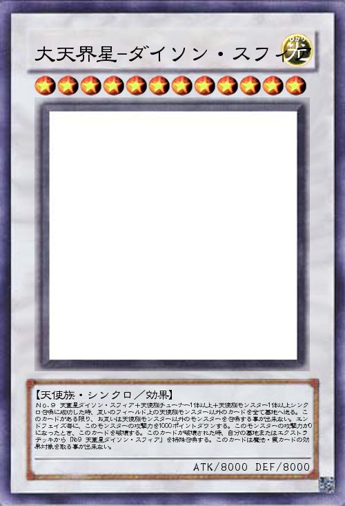 No.9 天蓋星ダイソン・スフィア+天使族チューナー1体以上+天使族モンスター1体以上シンクロ召喚に成功した時、互いのフィールド上の天使族モンスター以外のカードを全て墓地へ送る。このカードがある限り、お互いは天使族モンスター以外のモンスターを召喚する事が出来ない。エンドフェイズ毎に、このモンスターの攻撃力を1000ポイントダウンする。このモンスターの攻撃力が0になったとき、このカードを破壊する。このカードが破壊された時、自分の墓地またはエクストラデッキから「No9 天蓋星ダイソン・スフィア」を特殊召喚する。このカードは魔法・罠カードの効果対象を取る事が出来ない。 |