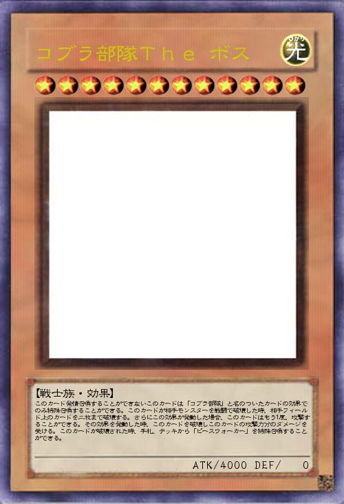 | このカード発情召喚することができないこのカードは「コブラ部隊」と名のついたカードの効果でのみ特殊召喚することができる。このカードが相手モンスターを戦闘で破壊した時、相手フィールド上のカードを二枚まで破壊する。さらにこの効果が発動した場合、このカードはもう1度、攻撃することができる。その効果を発動した時、このカードを破壊しこのカードの攻撃力分のダメージを受ける。このカードが破壊された時、手札、デッキから「ピースウォーカー」を特殊召喚することができる。 | |||