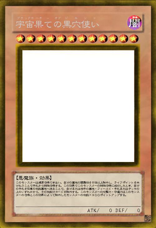 | このモンスターは通常召喚できない。自分の墓地の闇属性を5体以上除外し、ライフポイントを半分払うことで手札から特殊召喚する。この効果でこのモンスターの特殊召喚に成功したとき、自分の手札を任意の枚数墓地へ送ることで、自分または相手の墓地・フィールド・手札またはデッキの上のいずれかから、その枚数分カードを除外する。このモンスターの攻撃力・守備力はこのモンスターの召喚とこの効果によって除外したモンスターの枚数×300ポイントアップする。 | |||