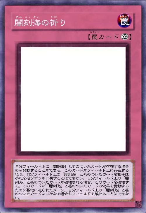 | 自分フィールド上に「闇刻海」と名のついたカードが存在する場合のみ発動することができる。このカードがフィールド上に存在する限り、自分フィールド上の「闇刻海」と名のついたカードを相手は手札を及びデッキに戻すことはできない。自分フィールド上の「闇刻海」と名のついたカードが破壊される場合、このカードを破壊する。このカードが「闇刻海」と名のついたカードの効果を発動するために墓地に送られたターン、自分フィールド上の「闇刻海」と名のついたカードはいかなる場合もフィールドを離れることはできない。 | |||