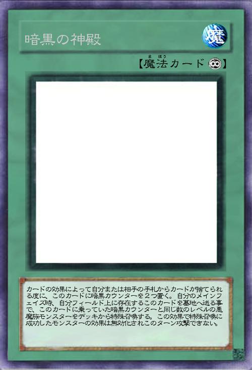 | カードの効果によって自分または相手の手札からカードが捨てられる度に、このカードに暗黒カウンターを2つ置く。自分のメインフェイズ時、自分フィールド上に存在するこのカードを墓地へ送る事で、このカードに乗っていた暗黒カウンターと同じ数のレベルの悪魔族モンスターをデッキから特殊召喚する。この効果で特殊召喚に成功したモンスターの効果は無効化されこのターン攻撃できない。 | |||