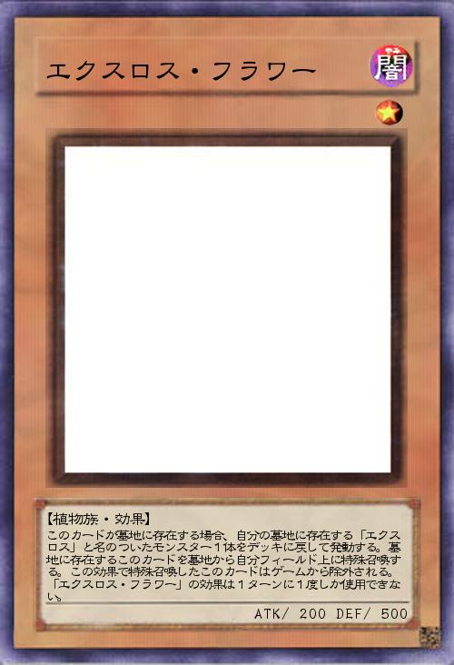 | このカードが墓地に存在する場合、自分の墓地に存在する「エクスロス」と名のついたモンスター1体をデッキに戻して発動する。墓地に存在するこのカードを墓地から自分フィールド上に特殊召喚する。この効果で特殊召喚したこのカードはゲームから除外される。「エクスロス・フラワー」の効果は1ターンに1度しか使用できない。 | |||