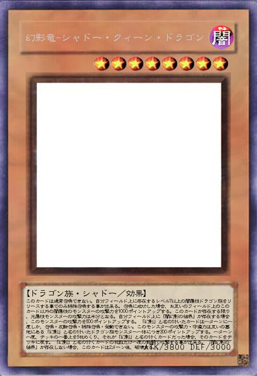 | このカードは通常召喚できない。自分フィールド上に存在するレベル7以上の闇属性ドラゴン族をリリースする事でのみ特殊召喚する事が出来る。召喚に成功した場合、お互いのフィールド上のこのカード以外の闇属性のモンスターの攻撃力を1000ポイントアップする。このカードが存在する限り、光属性モンスターの攻撃力は半分となる。自分フィールド上に「闇幻影の結界」が存在する場合、このモンスターの攻撃力を500ポイントアップする。「幻影」と名の付いたカードは一ターンに一度しか、召喚・反転召喚・特殊召喚・発動できない。このモンスターの攻撃力・守備力は互いの墓地にある「幻影」と名の付いたドラゴン族モンスター一体につき300ポイントアップする。一ターン一度、デッキの一番上を5枚めくり、それが「幻影」と名の付くカードだった場合、そのカードをデッキに戻す。「幻影」と名の付くカードの枚数だけ一度の戦闘で攻撃する事が出来る。「 | |||