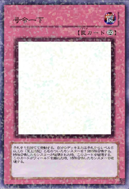 | 手札を1枚捨てて発動する。自分のデッキまたは手札からレベル5以上の「至上法院」と名のついたモンスターを1体特殊召喚する。特殊召喚したモンスターが破壊された時、このカードを破壊する。このカードがフィールドを離れた時、特殊召喚したモンスターを破壊する。 | |||