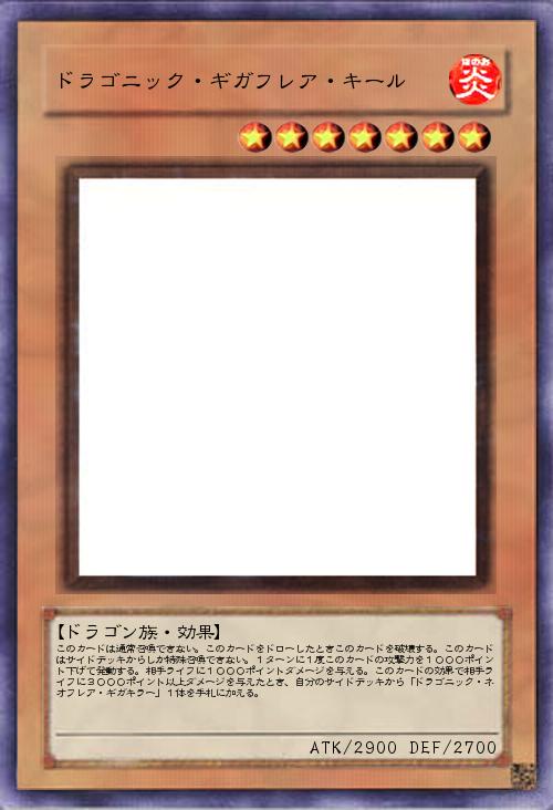 | このカードは通常召喚できない。このカードをドローしたときこのカードを破壊する。このカードはサイドデッキからしか特殊召喚できない。1ターンに1度このカードの攻撃力を1000ポイント下げて発動する。相手ライフに1000ポイントダメージを与える。このカードの効果で相手ライフに3000ポイント以上ダメージを与えたとき、自分のサイドデッキから「ドラゴニック・ネオフレア・ギガキラー」1体を手札に加える。 | |||