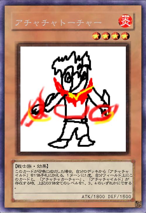 | このカードが召喚に成功した場合、自分のデッキから「アチャチャイルド」を1体手札に加える。1ターンに1度、自分フィールド上にこのカードと、「アチャチャカーチャー」、「アチャチャイルド」が存在する時、上記の3体全てのレベルを1、3、4のいずれかにできる。 | |||