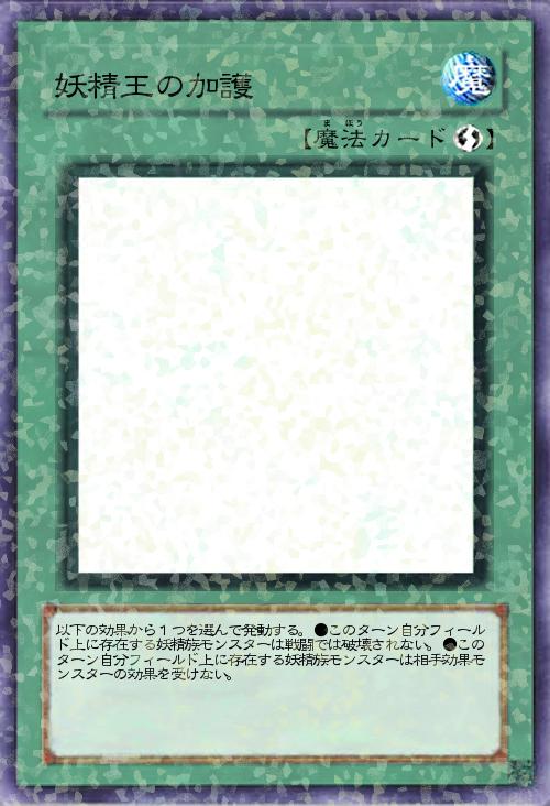 「貧弱なステータス+並べることが得意な妖精さんを守る魔法カード。2つ目の効果は魔法罠から守る効果でしたが、それだと万能すぎたのであえて外してみました((」(2012-10-19 14:43)