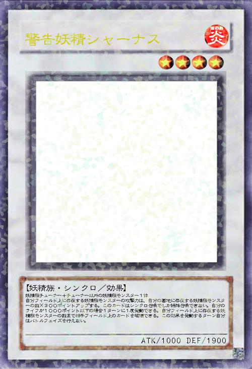 妖精族チューナー+チューナー以外の妖精族モンスター1体 自分フィールド上に存在する妖精族モンスターの攻撃力は、自分の墓地に存在する妖精族モンスターの数×300ポイントアップする。このカードはシンクロ召喚でしか特殊召喚できない。自分のライフが1000ポイント以下の場合1ターンに1度発動できる。自分フィールド上に存在する妖精族モンスターの数まで相手フィールド上のカードを破壊できる。この効果を発動するターン自分はバトルフェイズを行えない。 |