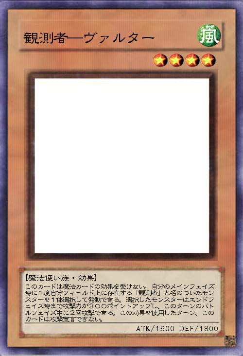 | このカードは魔法カードの効果を受けない。自分のメインフェイズ時に1度自分フィールド上に存在する「観測者」と名のついたモンスターを1体選択して発動できる。選択したモンスターはエンドフェイズ時まで攻撃力が300ポイントアップし、このターンのバトルフェイズ中に2回攻撃できる。この効果を使用したターン、このカードは攻撃宣言できない。 | |||