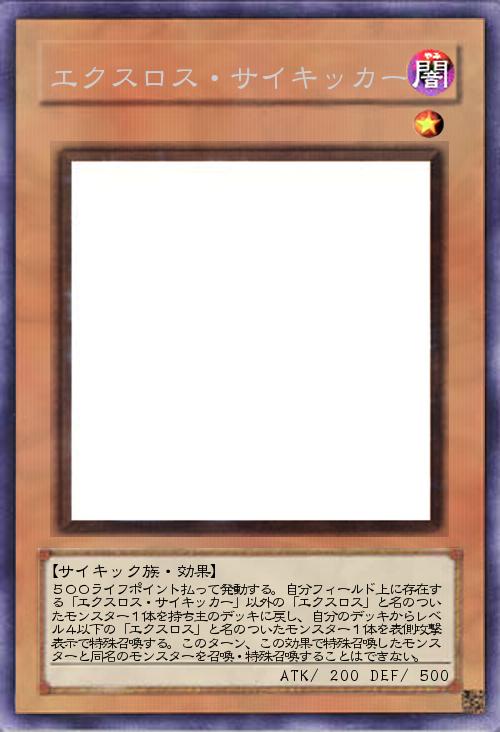 | 500ライフポイント払って発動する。自分フィールド上に存在する「エクスロス・サイキッカー」以外の「エクスロス」と名のついたモンスター1体を持ち主のデッキに戻し、自分のデッキからレベル4以下の「エクスロス」と名のついたモンスター1体を表側攻撃表示で特殊召喚する。このターン、この効果で特殊召喚したモンスターと同名のモンスターを召喚・特殊召喚することはできない。 | |||