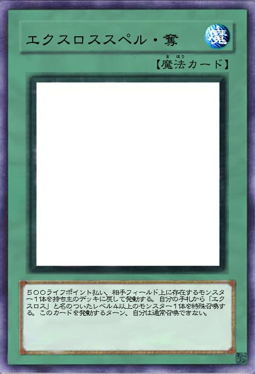 | 500ライフポイント払い、相手フィールド上に存在するモンスター1体を持ち主のデッキに戻して発動する。自分の手札から「エクスロス」と名のついたレベル4以上のモンスター1体を特殊召喚する。このカードを発動するターン、自分は通常召喚できない。 | |||