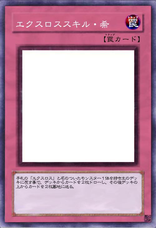 | 手札の「エクスロス」と名のついたモンスター1体を持ち主のデッキに戻す事で、デッキからカードを2枚ドローし、その後デッキの上からカードを2枚墓地に送る。 | |||