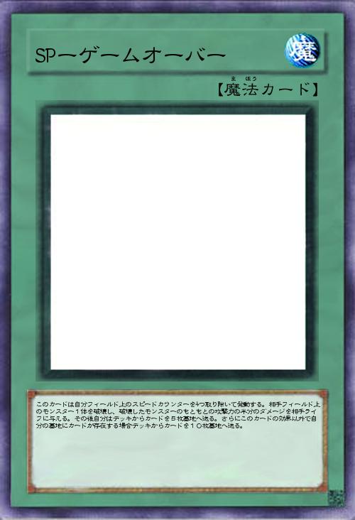 | このカードは自分フィールド上のスピードカウンターを4つ取り除いて発動する。相手フィールド上のモンスター1体を破壊し、破壊したモンスターのもともとの攻撃力の半分のダメージを相手ライフに与える。その後自分はデッキからカードを5枚墓地へ送る。さらにこのカードの効果以外で自分の墓地にカードが存在する場合デッキからカードを10枚墓地へ送る。 | |||