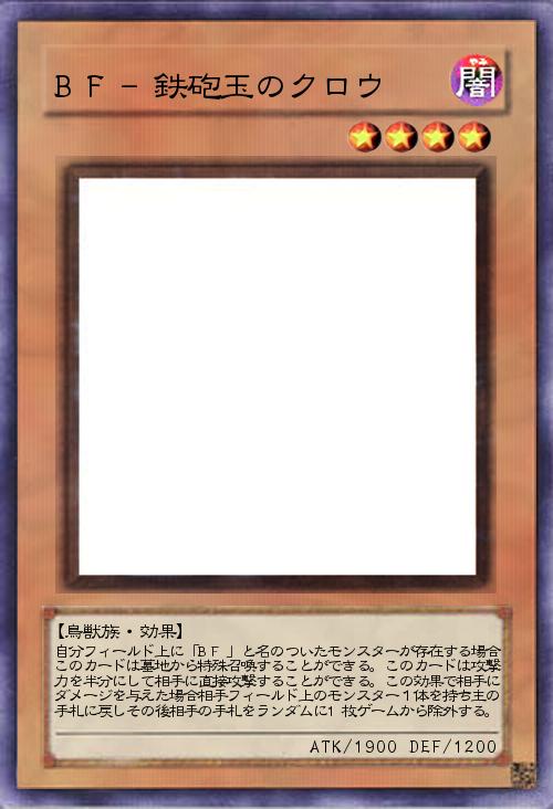 | 自分フィールド上に「BF」と名のついたモンスターが存在する場合このカードは墓地から特殊召喚することができる。このカードは攻撃力を半分にして相手に直接攻撃することができる。この効果で相手にダメージを与えた場合相手フィールド上のモンスター1体を持ち主の手札に戻しその後相手の手札をランダムに1枚ゲームから除外する。 | |||