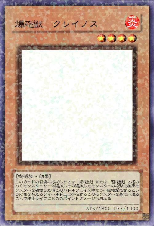 | このカードの召喚に成功したとき「爆砲獣」または「雷砲獣」と名のつくモンスターを一体選択しその選択したモンスターの攻撃で相手モンスターを破壊した時このバトルフェイズ中もう一回攻撃できるという効果を与えるフィールド上に存在するこのモンスターを墓地へ送ることで相手ライフに800ポイントダメージお与える | |||