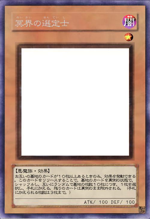 | お互いの墓地のカードが10枚以上あるときのみ、効果を発動できる。このカードをリリースすることで、墓地のカードを裏側の状態で、シャッフルし、互いにランダムで墓地の枚数10枚につき、1枚を選択し、手札に加える。残りのカードは裏側のまま除外される。(手札に加えられる枚数は3枚まで。) | |||