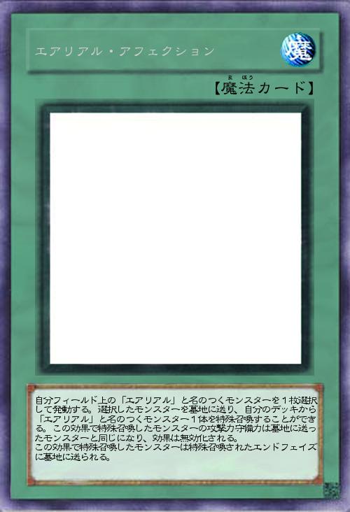 自分フィールド上の「エアリアル」と名のつくモンスターを1枚選択して発動する。選択したモンスターを墓地に送り、自分のデッキから「エアリアル」と名のつくモンスター1体を特殊召喚することができる。この効果で特殊召喚したモンスターの攻撃力守備力は墓地に送ったモンスターと同じになり、効果は無効化される。 この効果で特殊召喚したモンスターは特殊召喚されたエンドフェイズに墓地に送られる。 |