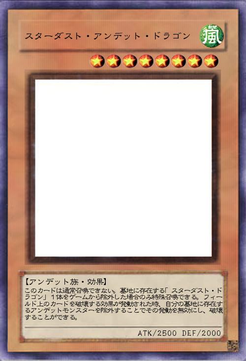 | このカードは通常召喚できない。墓地に存在する「スターダスト・ドラゴン」1体をゲームから除外した場合のみ特殊召喚できる。フィールド上のカードを破壊する効果が発動された時、自分の墓地に存在するアンデットモンスターを除外することでその発動を無効にし、破壊することができる。 | |||