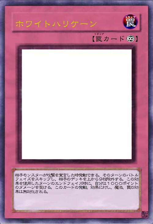 | 相手モンスターが攻撃を宣言した時発動できる。そのターンのバトルフェイズをスキップし、相手のデッキを上から9枚除外する。この効果を使用したターンのエンドフェイズ時に、自分は1000ポイントのダメージを受ける。このカードの発動、効果に対し、魔法、罠の効果は無効化される。 | |||