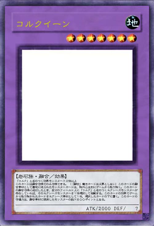 「コルク」と名のつく効果モンスター×2体以上 このカードは融合召喚でのみ召喚できる。(「融合」魔法カードは必要としない)このカードの融合素材として墓地に送られたモンスターカードは、除外とは別にゲームから取り除く。このカードの融合召喚に成功したとき、自分のフィールド上に「コルク」と名のつくエクシーズモンスターが存在していれば、そのエクシーズモンスターを1体選択して発動する。このカードの効果でゲームから取り除かれたカードをエクシーズ素材として1枚、選択したカードの下に置く。このカードの守備力は、融合素材に使用したモンスターの数×600ポイントとなる。 |