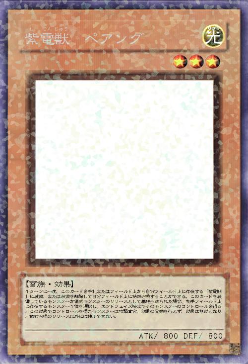 | 1ターンに一度、このカードを手札またはフィールド上から自分フィールド上に存在する「紫電獣」に装備、または装備を解除して自分フィールド上に特殊召喚することができる。このカードを装備しているモンスターが儀式モンスターのリリースとして墓地へ送られた場合、相手フィールド上に存在するモンスター1体を選択し、エンドフェイズ時までそのモンスターのコントロールを得る。この効果でコントロールを得たモンスターは攻撃宣言、効果の発動を行えず、効果は無効となり、儀式召喚のリリース以外には使用できない。 | |||