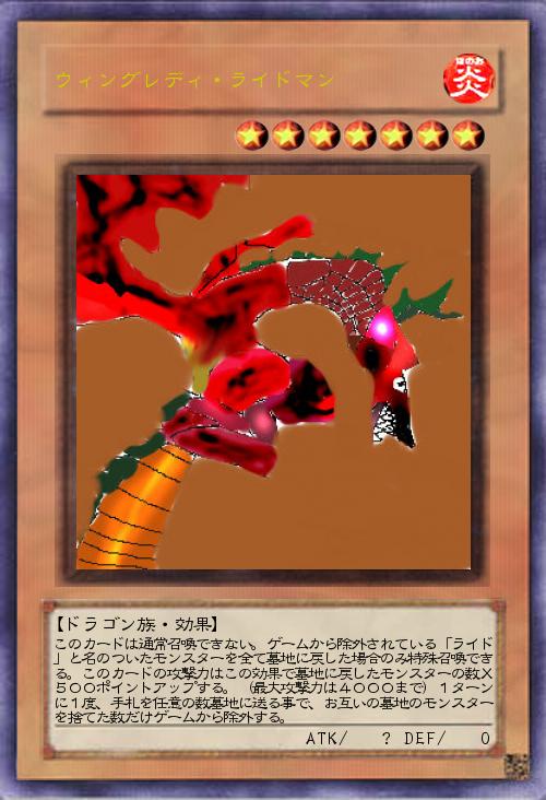 | このカードは通常召喚できない。ゲームから除外されている「ライド」と名のついたモンスターを全て墓地に戻した場合のみ特殊召喚できる。このカードの攻撃力はこの効果で墓地に戻したモンスターの数X500ポイントアップする。(最大攻撃力は4000まで)1ターンに1度、手札を任意の数墓地に送る事で、お互いの墓地のモンスターを捨てた数だけゲームから除外する。 | |||