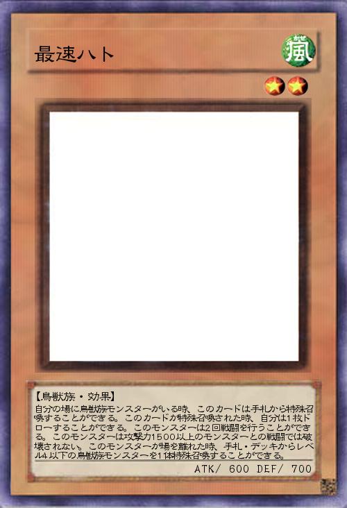 | 自分の場に鳥獣族モンスターがいる時、このカードは手札から特殊召喚することができる。このカードが特殊召喚された時、自分は1枚ドローすることができる。このモンスターは2回戦闘を行うことができる。このモンスターは攻撃力1500以上のモンスターとの戦闘では破壊されない。このモンスターが場を離れた時、手札・デッキからレベル4以下の鳥獣族モンスターを1体特殊召喚することができる。 | |||