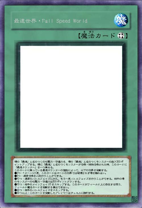 場の「最速」と名のつくの攻撃力・守備力を、場の「最速」と名のつくモンスターの数×300ポイントアップする。場に「最速」と名のつくモンスターが召喚・特殊召喚された時、このカードに「最速カウンター」を一つ乗せる。 このカードに乗っている最速カウンターの個数によって、以下の効果を発動する。 ●3つ:1ターンに1度、このカードはカードの効果では破壊されず場を離れない。 ●5つ:通常召喚を二回行うことができる。 ●10つ:通常のバトルフェイズに加え、もう一度バトルフェイズを行うことができる。相手の場のモンスターの攻撃力・守備力は500ポイントダウンする。 ●15つ:相手のメインフェイズ1をスキップする。このカードがフィールド上に存在する限り、フィールド魔法カードを発動する事はできない。 ●20つ:相手のバトルフェイズをスキップする。 ●30つ以上:このカードを発動したプレイヤーはデュエルに勝利する。 |