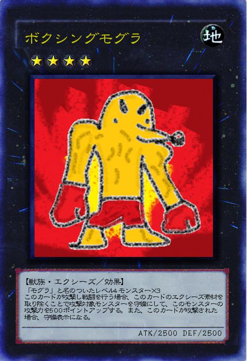 「モグラ」と名のついたレベル4モンスター×3 このカードが攻撃し戦闘を行う場合、このカードのエクシーズ素材を取り除くことで攻撃対象モンスターを守備にして、このモンスターの攻撃力を500ポイントアップする。また、このカードが攻撃された場合、守備表示になる。 |