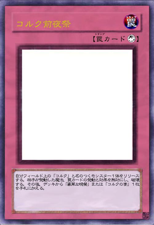 | 自分フィールド上の「コルク」と名のつくモンスター1体をリリースする。相手が発動した魔法、罠カードの発動と効果を無効にし、破壊する。その後、デッキから「豪華な晩餐」または「コルクの宴」1枚を手札に加える。 | |||